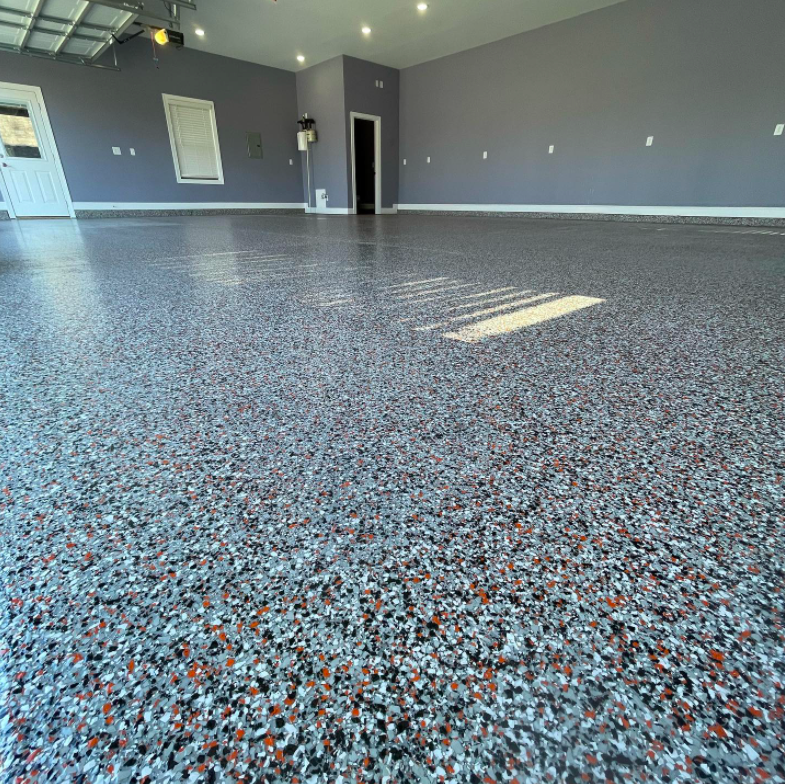 Available in a wide variety of colors and color combinations, polyaspartic garage floor coating can turn a neglected garage space into a clean, professional area for weekend hobbyists and business owners. Best of all, concrete surfaces treated with polyaspartic concrete coatings always look neat and clean with our flake coating. The scratch resistant coating will last for years to come.
